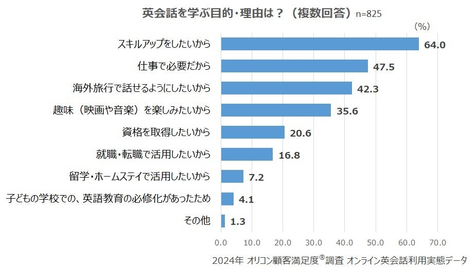 これらの結果から、「スキルアップしたい」と「仕事で必要」という実用的な理由が高い割合を占める一方で、趣味やレジャーを楽しむための学習意欲も無視できない動機となっていることが明らかとなり、英語学習へのアプローチが多様化していることが反映された結果と読み取ることができます。