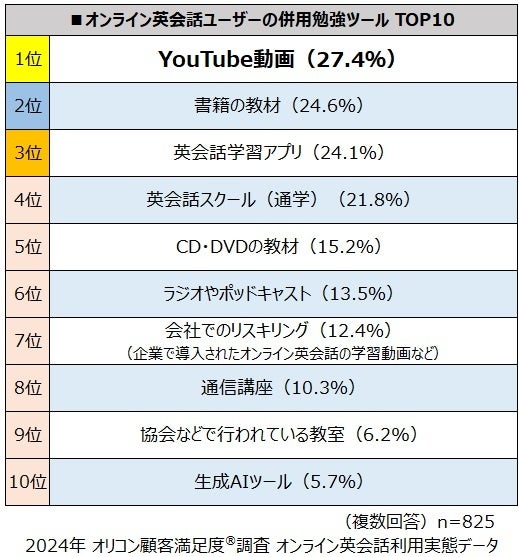 <利用実態データ> オンライン英会話ユーザーの併用勉強ツール TOP10:1位は「YouTube動画」、ほか「会社でのリスキリング」「生成AIツール」を活用する人も