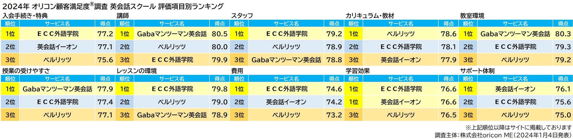 また総合4位の【Gabaマンツーマン英会話(株式会社GABA 本社:東京都品川区)】は、評価項目別「講師」「教室環境」「授業の受けやすさ」の3項目で1位に。なかでも、「講師」「教室環境」は2022年から3年連続1位となっています。部門でも、年代別「50代」で2020年から5年連続1位となりました。