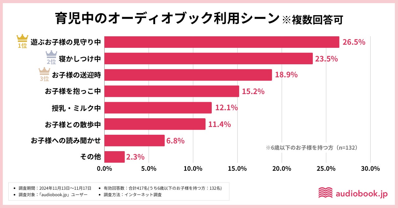 ・オーディオブックを使う具体的な育児シーンは、お子様から目を離せない「遊ぶお子様の見守り中」(26.5%)、次いで部屋を暗くしなければならない「寝かしつけ中」(23.5%)