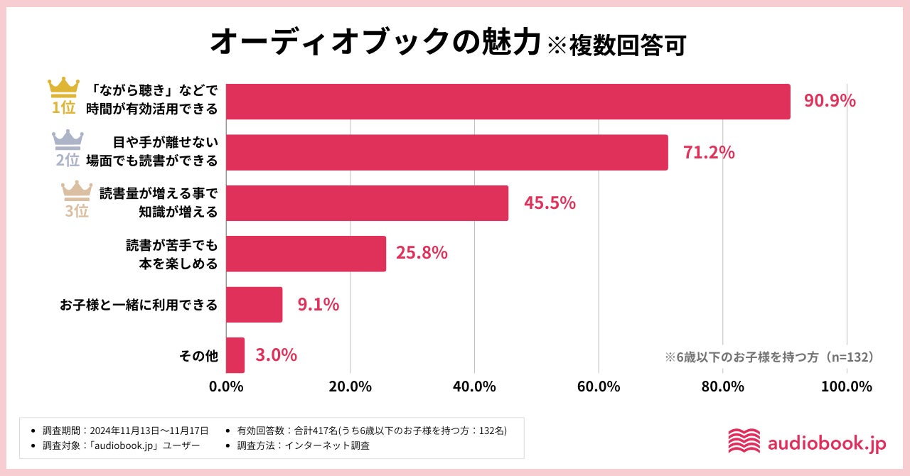 さらに、育児をしながらオーディオブックを利用している方々が、オーディオブックのどこに魅力を感じているのかについても調査。