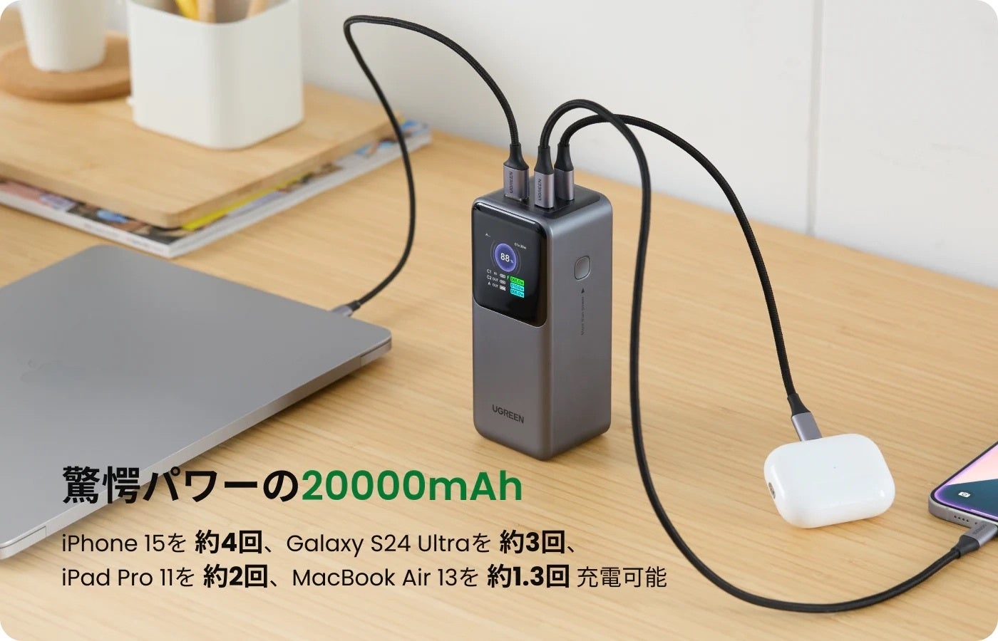 iPhone 15を約4回、Galaxy S24 Ultraを約3回、iPad Pro 11インチを約2回、MacBook Air 13インチを約1.3回充電可能です。20000mAhの大容量なので安心感があります。デザインは手のひらにおさまるタテ型で、スマートに持ち運べるノートPC用モバイルバッテリーです