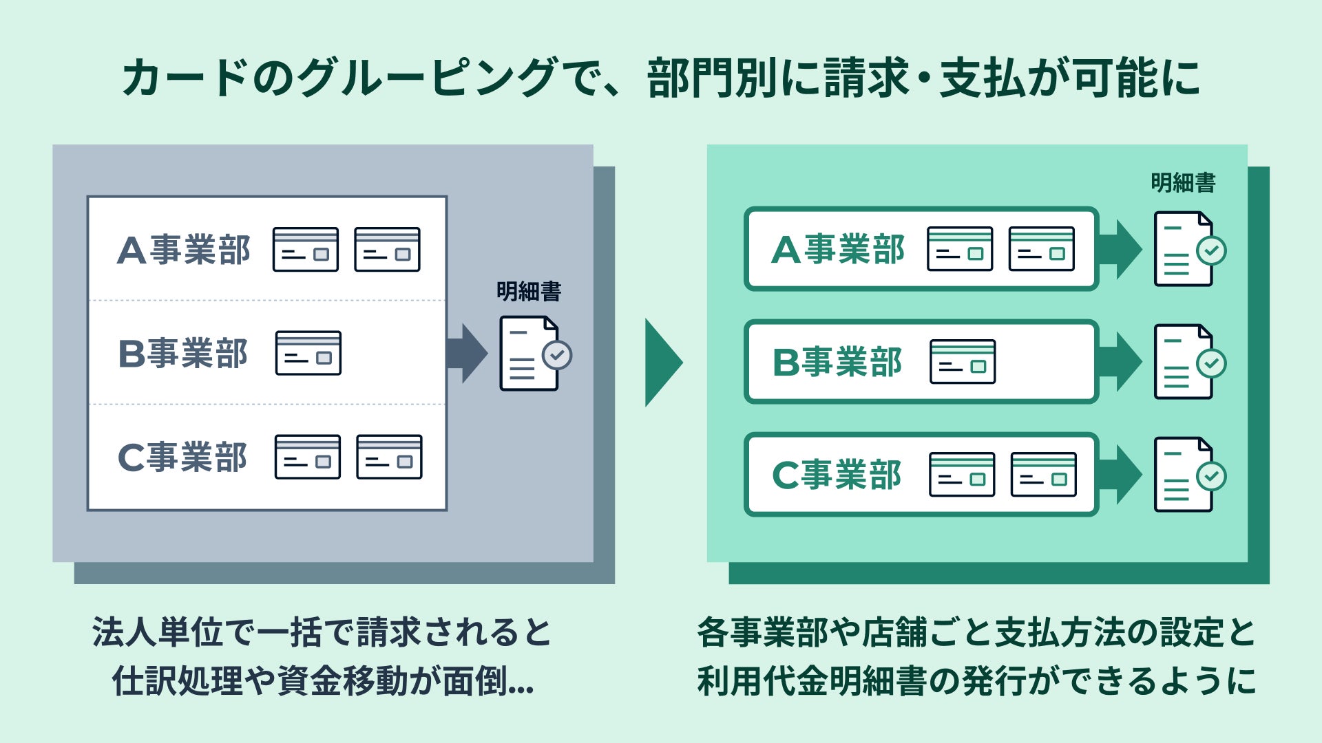 本機能により、任意の組織単位でのカードご利用代金の支払い方法の設定やご利用代金明細書(請求書)の発行が可能になります。