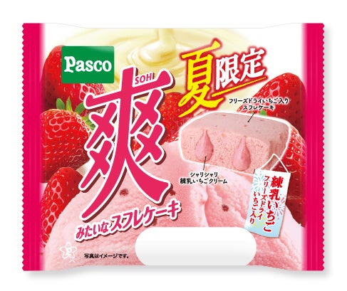 国産小麦の小麦粉を100%使用した、くちどけの良いスフレケーキ生地に、練乳いちごの風味と「爽」のシャリシャリ食感を再現した爽快感のあるクリームを入れて仕上げました。