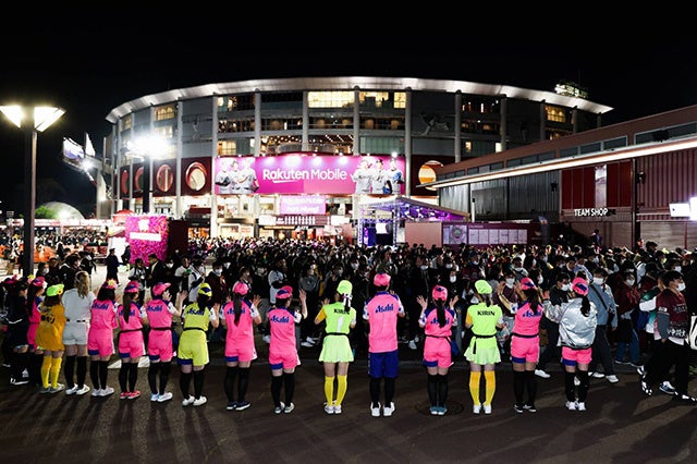試合に挑む楽天イーグルスの選手を売子とスタッフがフィールドに送り出します。