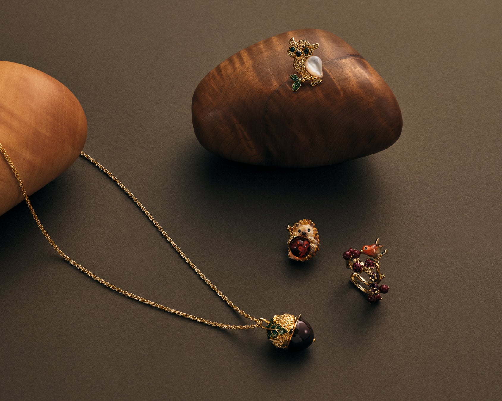 秋の森で出会う可愛らしい動物など遊び心たっぷりのモチーフコレクション。白蝶貝の翼が艶めくフクロウと、琥珀のどんぐりを抱えたハリネズミのブローチ。赤いベリーの木にやってきたコマドリのイヤーカフや、帽子を開閉できるどんぐりのロケットネックレスなど、熟練の職人がひとつひとつ丁寧に仕上げたディティールにこだわったアイテムが揃います。
