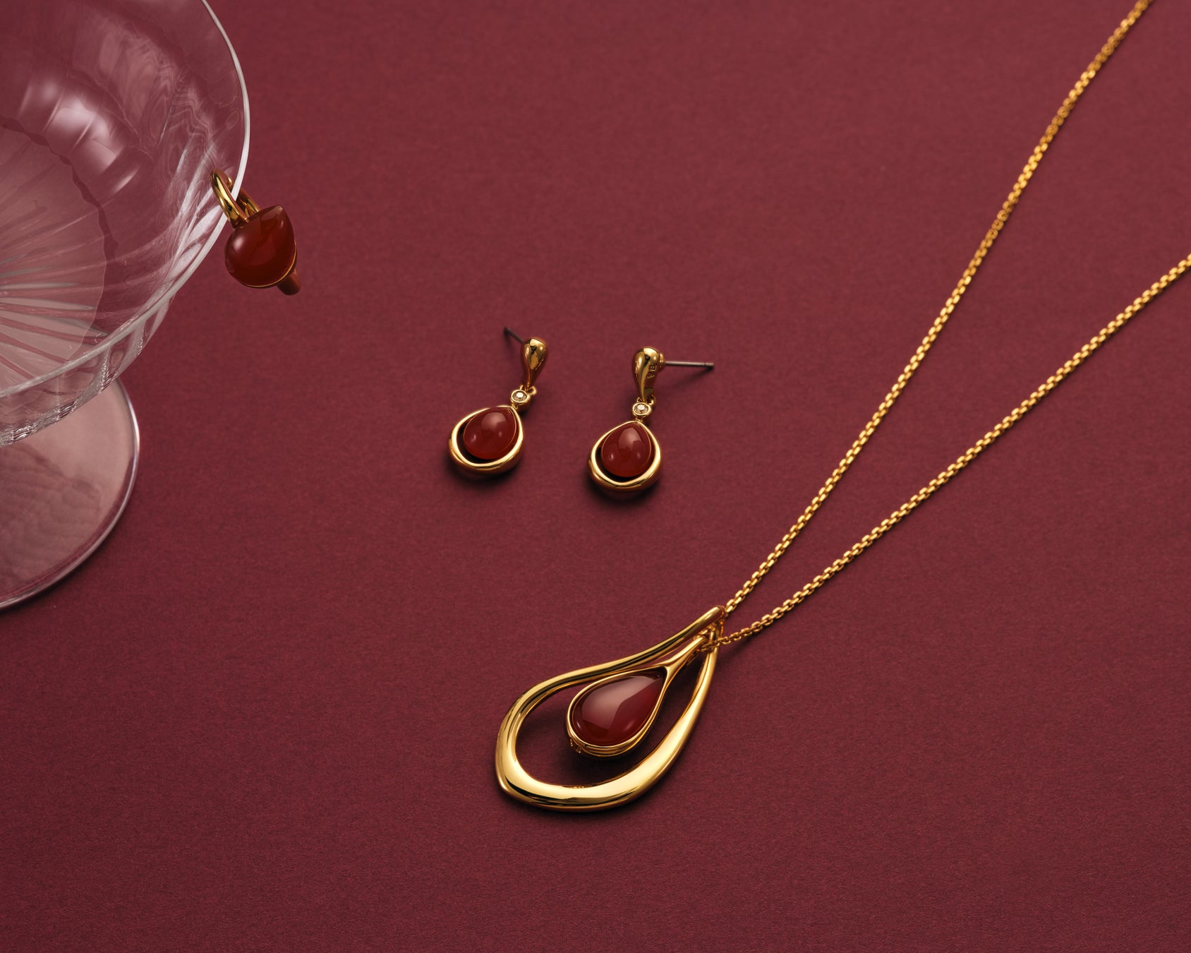 グラスワインを思わせる、艶やかなバーガンディーレッドのカーネリアンが印象的なコレクション。チェンジャブル仕様のネックレスは、シャンパンカラーのカットガラスの輝きが華やかにきらめくリバーシブルデザイン。フレームの着脱も可能で多彩な表情を楽しめます。