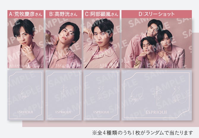 全国のマツキヨココカラ&カンパニーのグループ店舗(一部店舗を除く)にて、対象商品である「エスプリーク トリプル ラスティング プライマー ウォームピンク」をご購入していただいたお客さまに、店頭で全4種類の撮り下ろしオリジナルトレカをランダムで1枚プレゼント。
