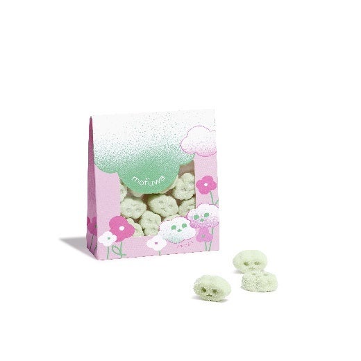 “もふふわ”食感が楽しめる雲形の「mofuwa」を一口サイズに小さくした、何とも言えない癒し系の表情が楽しいマシュマロです。緑色のメロンソーダ味の「mofuwaプチ」が春らしいパッケージの窓からのぞく姿もかわいい商品です。