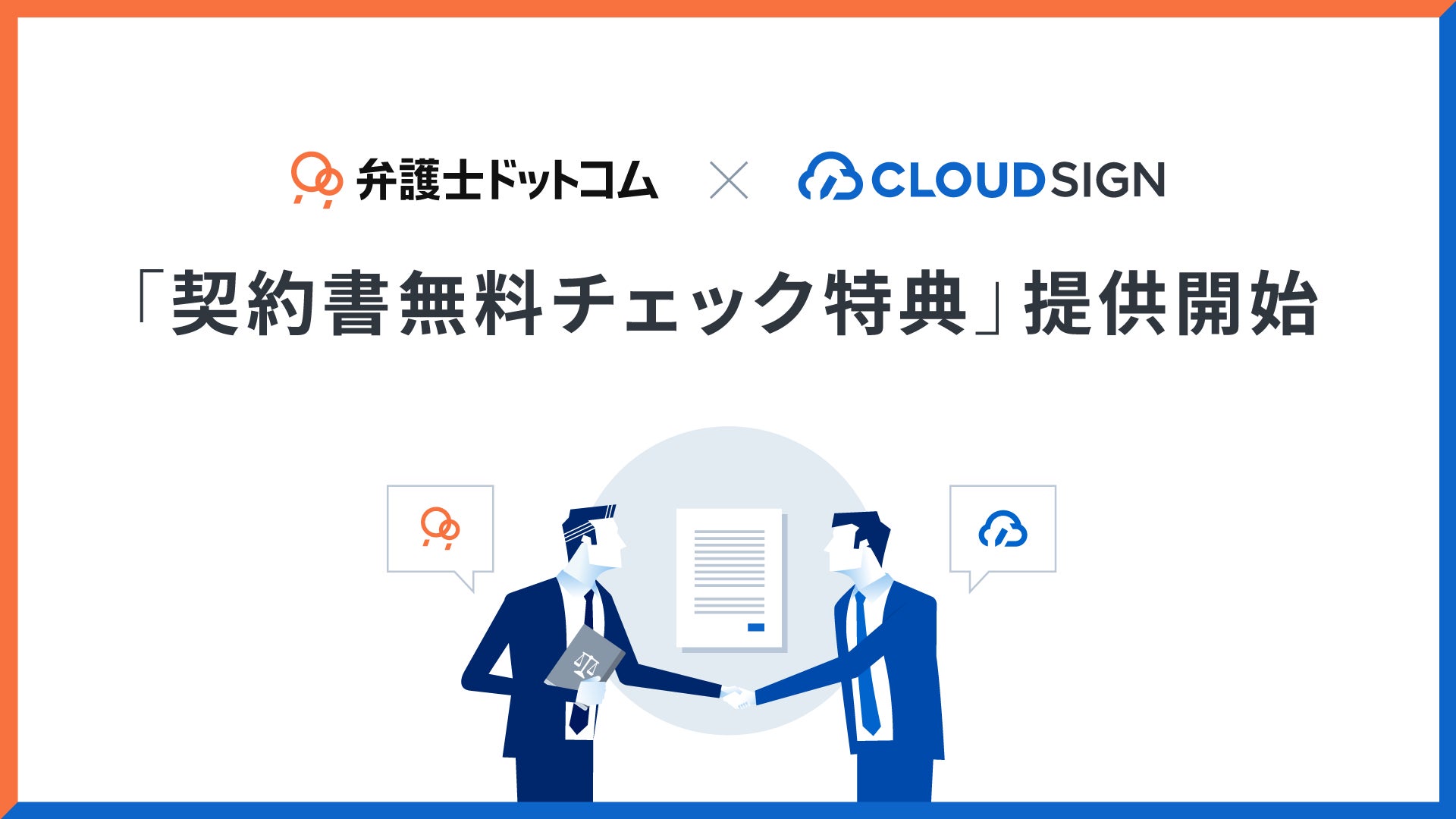 弁護士ドットコム株式会社(東京都港区、代表取締役社長 兼 CEO:元榮 太一郎、以下当社)が提供する契約マネジメントプラットフォーム「クラウドサイン®︎」と当社が運営する日本最大級の法律相談・弁護士検索ポータルサイト「弁護士ドットコム®︎」は、「クラウドサイン®︎」の有料プランユーザー向けに、同サイトに登録する弁護士から契約書(一通)の初回チェックを無料で受けることができる連携プログラムの提供を開始することをお知らせします。