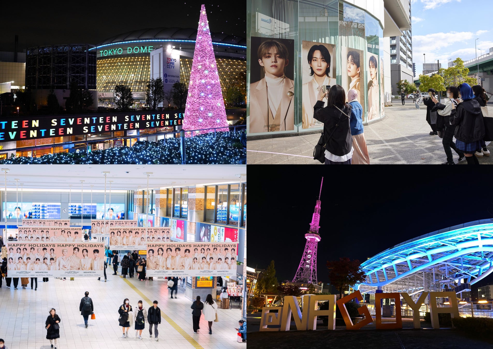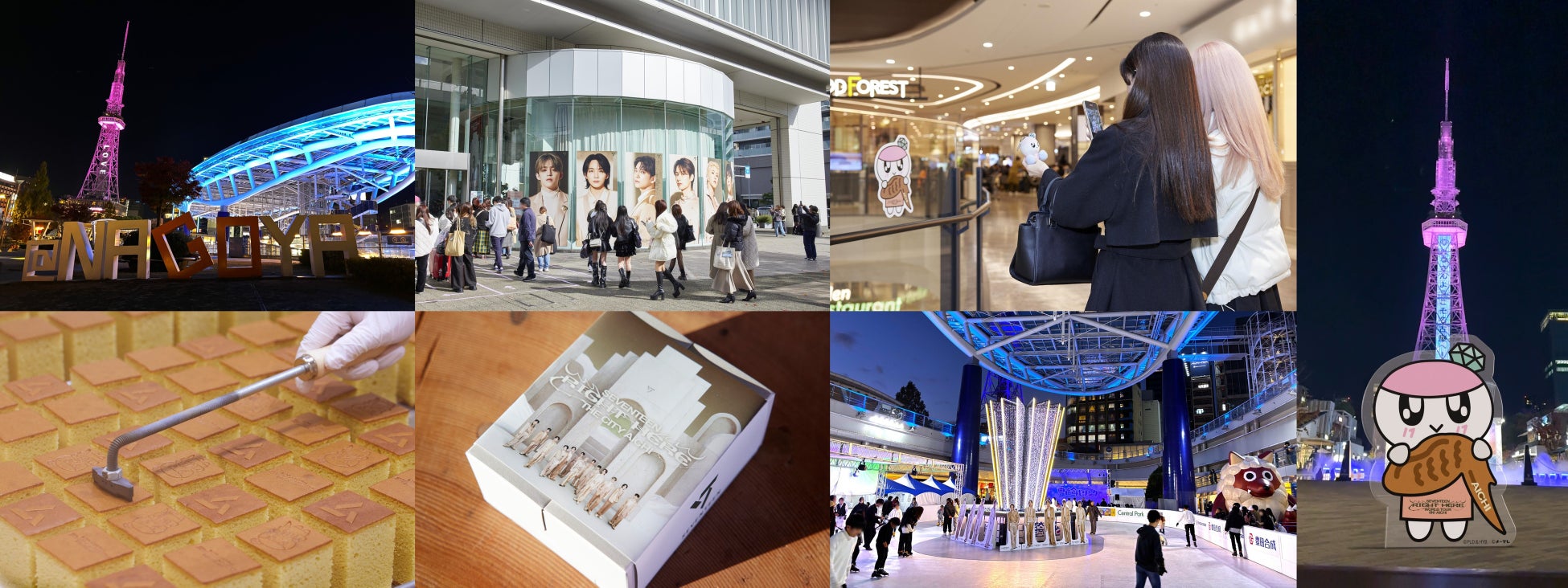 愛知では、名古屋の中心地・栄に位置するランドマークである中部電力 MIRAI TOWERと、オアシス21がSEVENTEENの公式カラーである「Rose Quartz & Serenity」に彩られ、名古屋テレビ(メ~テレ)でも大型ビジュアルが掲示されました。また、名古屋栄三越をはじめとした商業施設でもコラボレーションが行われ、中日ビルにあるカステラ専門店「DE CARNERO CASTE NAGOYA」では、SEVENTEENのキャラクター「ボンボンイ」が焼印された限定カステラを販売し連日盛況を見せました。