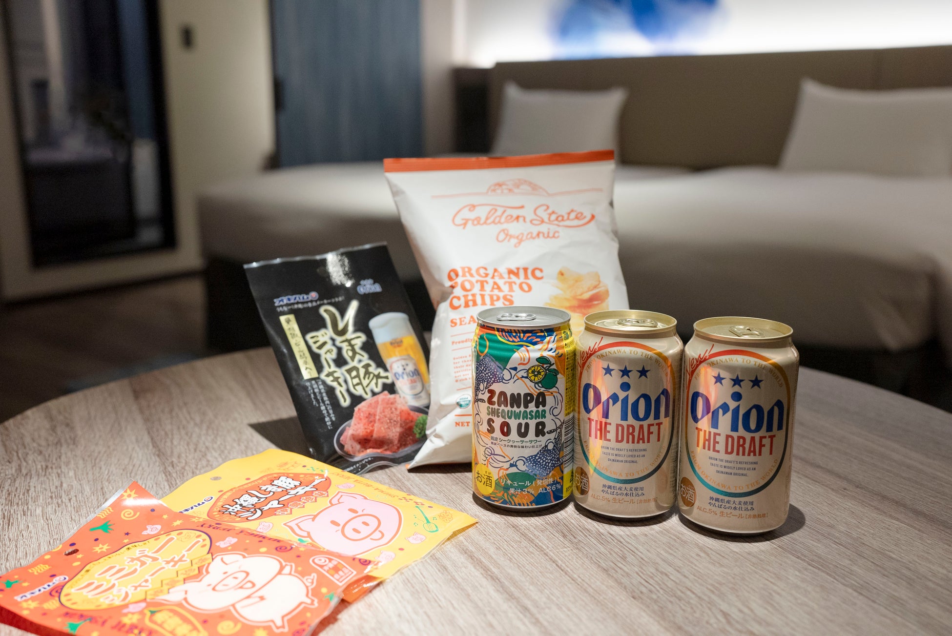 花火鑑賞のお供には、地元ならではのドリンクやおつまみをお好みの組み合わせでお選びいただけます。沖縄の気候に合った爽快な喉ごしとマイルドな味わいが特徴のビール、おつまみにはコリコリとした食感のミミガーを使用したジャーキーなどを用意。地元ならではのドリンクやおつまみを味わいながら、花火をご覧いただけます。