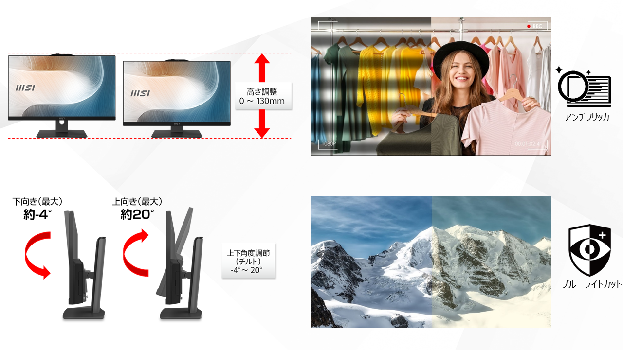 また、アンチフリッカー・ブルーライトカット機能により長時間の使用でも目の疲労を軽減します。