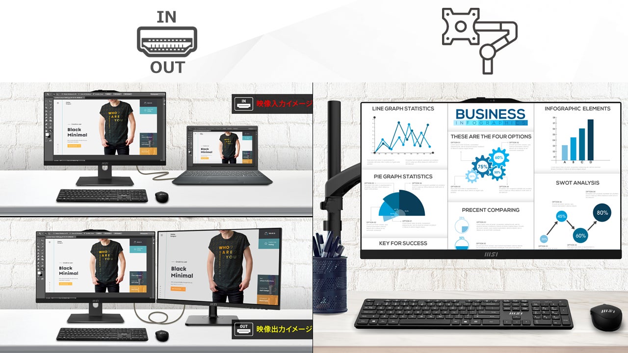 「Modern AM242P 11M-1441JP」は丁度よい大きさの23.8インチ、フルHD(1,920 × 1,080)解像度、高画質・広視野角が特徴なIPSパネルを搭載した液晶モニター内部にデスクトップPCとしての機能を搭載しており、モニター1台分のスペースでPCとして利用することが出来ます。インテル® Core™ i5-1135G7、SSD 256GB(M.2 NVMe) +HDD 1TB(2.5インチ)、16GBの大容量メモリを搭載しておりマルチタスクも快適にこなすことが出来ます。MSI独自のソフトウェアとしてシステム設定やマイクのノイズキャンセル機能の追加が可能なMSI Centerがプリインストールされており、機能としてテレワークやデュアルモニター環境を手軽に導入可能なHDMI入出力端子、プライバシーシャッター付きWebカメラ、アンチフリッカー、ブルーライト軽減機能を搭載することで長時間の使用においても目の疲れを抑え、オフィスワーク・テレワーク・オンライン授業などに最適です。また、VESAマウントにも対応しモニターアームに取り付け、使用しないときは端へ移動しデスクスペースを確保することも可能です。なお、付属品には設定が不要ですぐに使用することができるワイヤレスキーボード・マウスが付属しており、ケーブルや設置場所を気にせずに利用可能です。