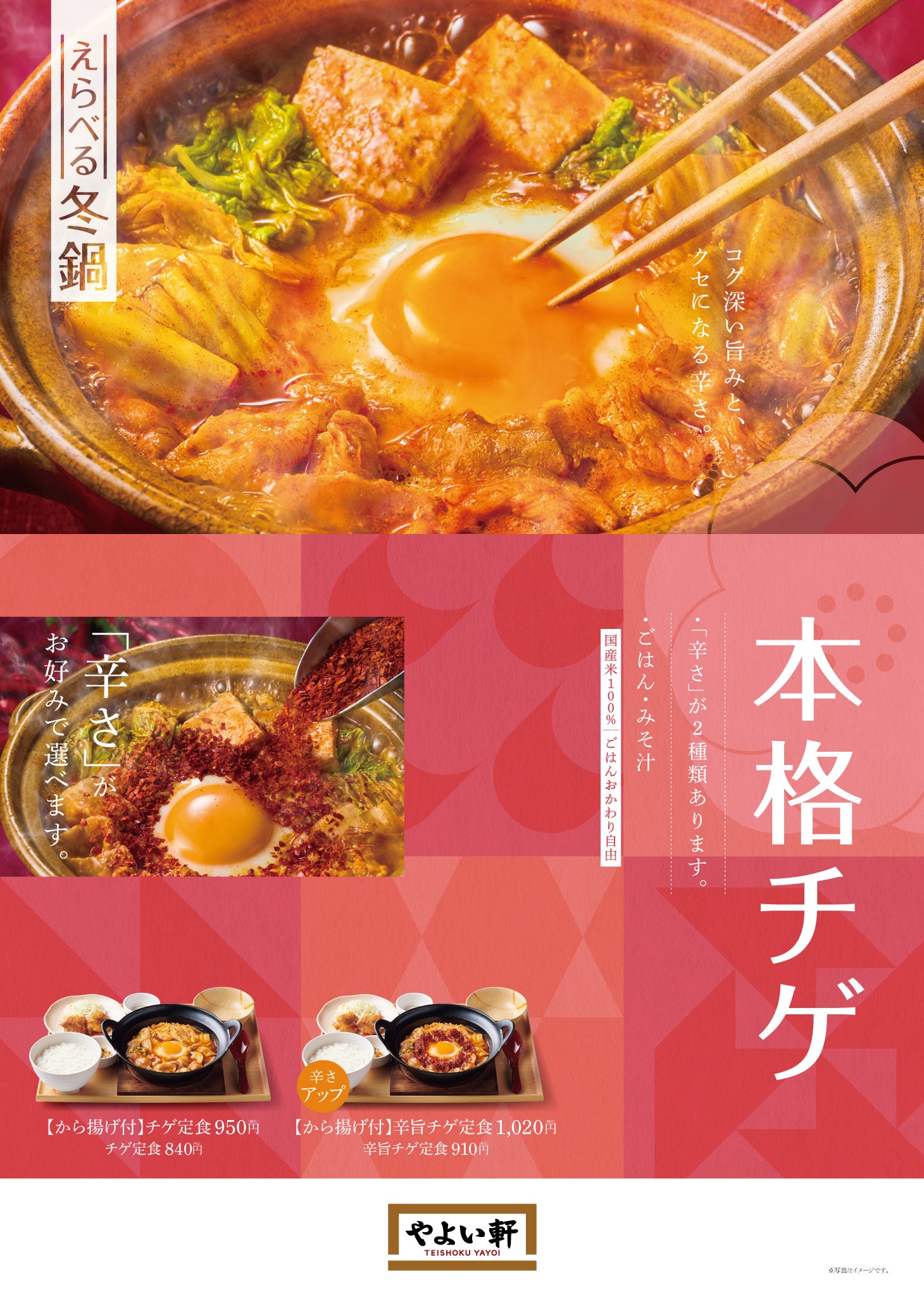 辛さを楽しみながら召し上がっていただきたい「やよい軒」のチゲは、コクのある信州味噌と本醸造醤油をベースに、唐辛子、コチュジャンの辛さを加え、魚醤、ほたて、えびなどの魚介の風味と旨味を効かせたまろやかな辛さに仕上げました。より刺激的な辛さをお求めの方には、4種の唐辛子をブレンドした特製唐辛子パウダーを加え、辛味をアップした“辛旨チゲ”もご用意しました。定番人気のジューシーなから揚げ小鉢の有無もお好みで選ぶことができますので、その日の気分に合わせてお楽しみください。“えらべる冬鍋”は、第一弾としてじっくり旨味を閉じ込めた風味豊かな『すき焼き定食』を展開しています。今後第三弾も発売予定です。体の芯から温まる「やよい軒」“えらべる冬鍋”シリーズをぜひお楽しみください。