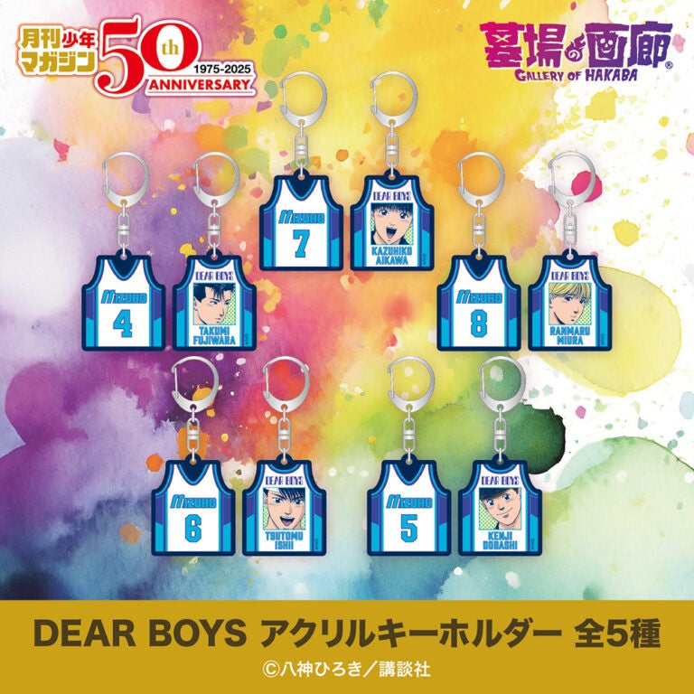 リアルなバスケ描写と青春の輝きを詰め込んだ『DEAR BOYS』から、瑞穂高校のユニフォームをモチーフにしたメンバー5人のアクリルキーホルダーが登場!平成レトロ感のあるファンシーグッズを彷彿とさせるポップなデザインが愛らしい全5種!推しを身に付けて応援気分を盛り上げよう。