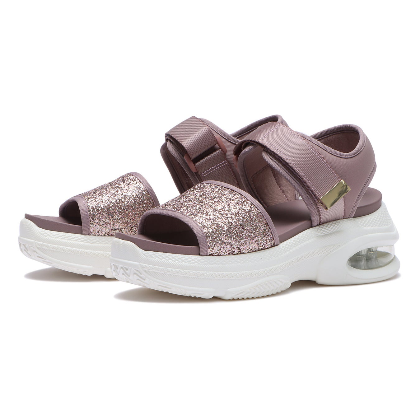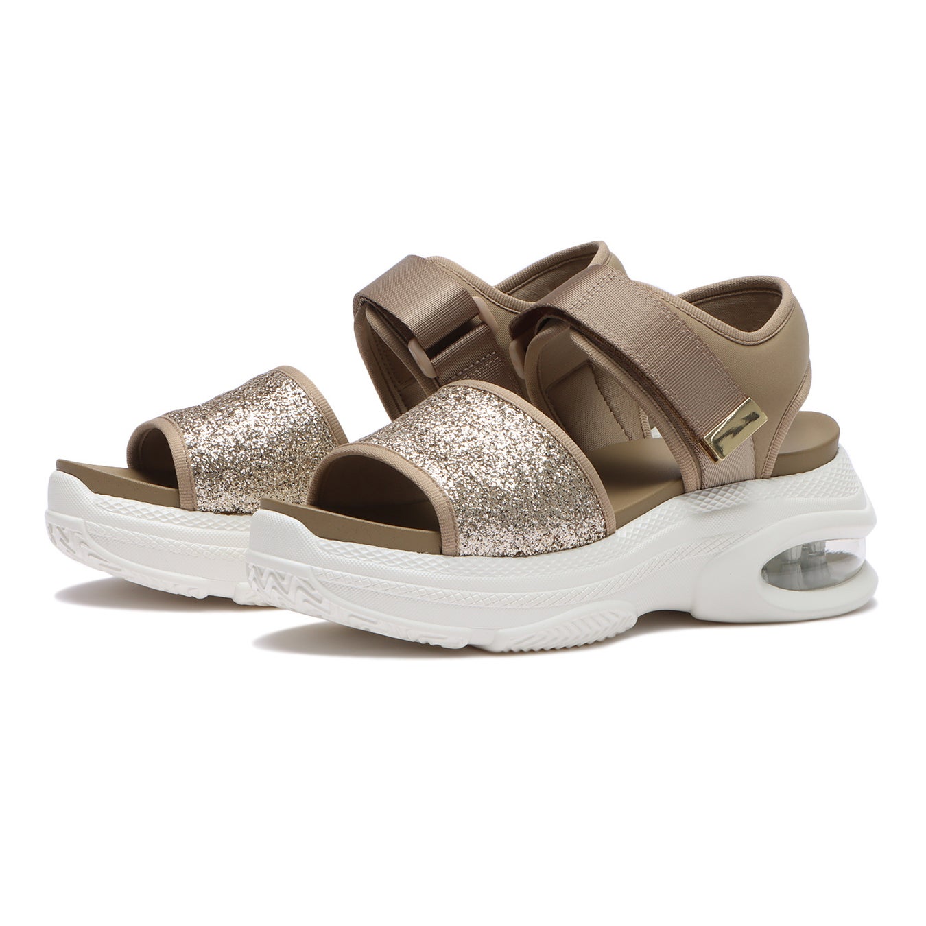 キラキラと繊細に輝く、品のあるグリッターに心ときめくデザイン。エアチューブやマジックテープベルトの機能性が特長。3色のカラーバリエーションで欲しくなる主役級の存在感をプラスし、フットベットとソールの組み合わせでクッション性を高め、歩きやすさはもちろん、厚底による脚長効果も期待できます。