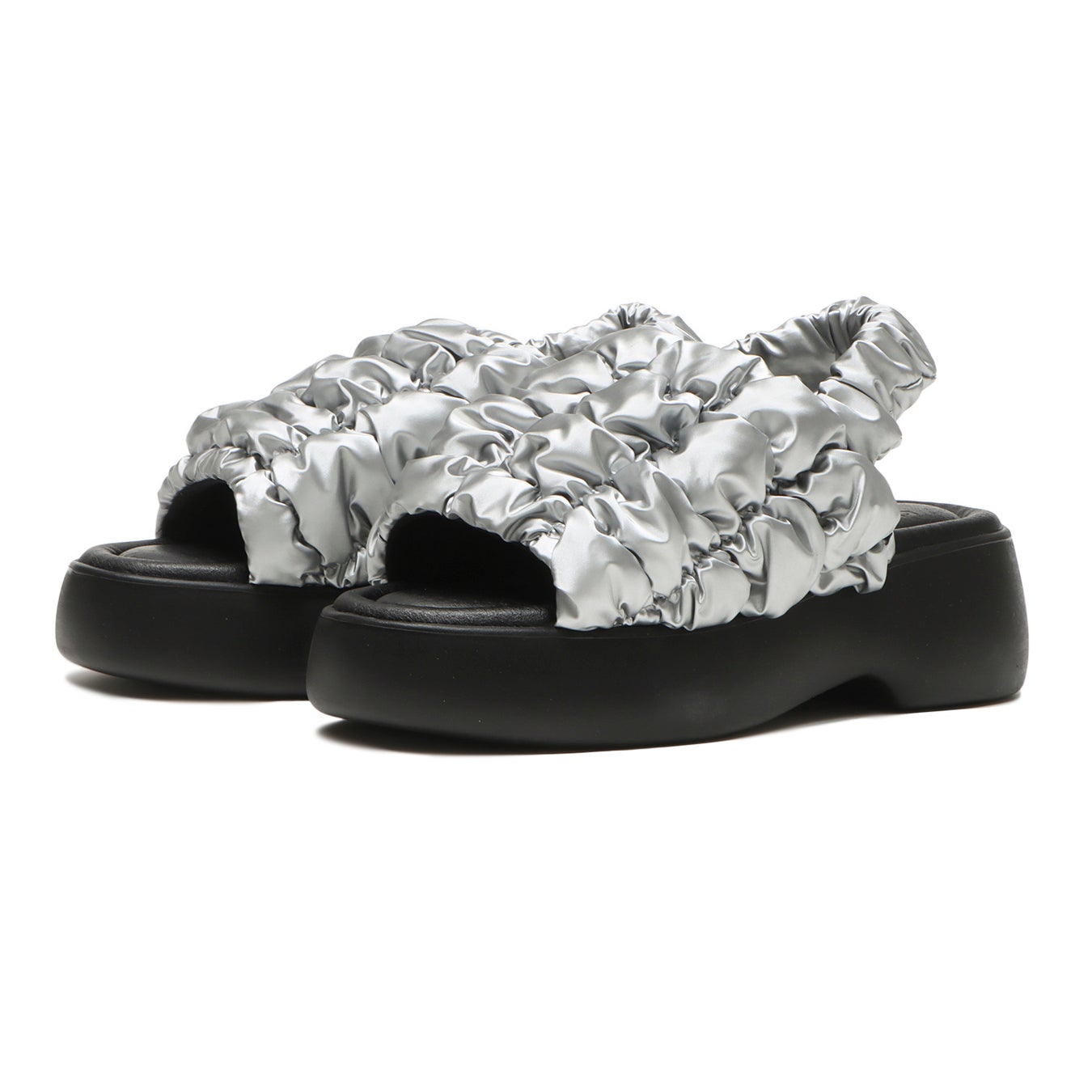 インパクトの大きいボリュームのあるソールとパフアッパーのバランス感がトレンド感のある一足。厚みのあるソールは軽量でクッション性のあるフットベットで、快適な履き心地を提供します。また、バックストラップには伸縮性のある素材を使い着脱も容易です。