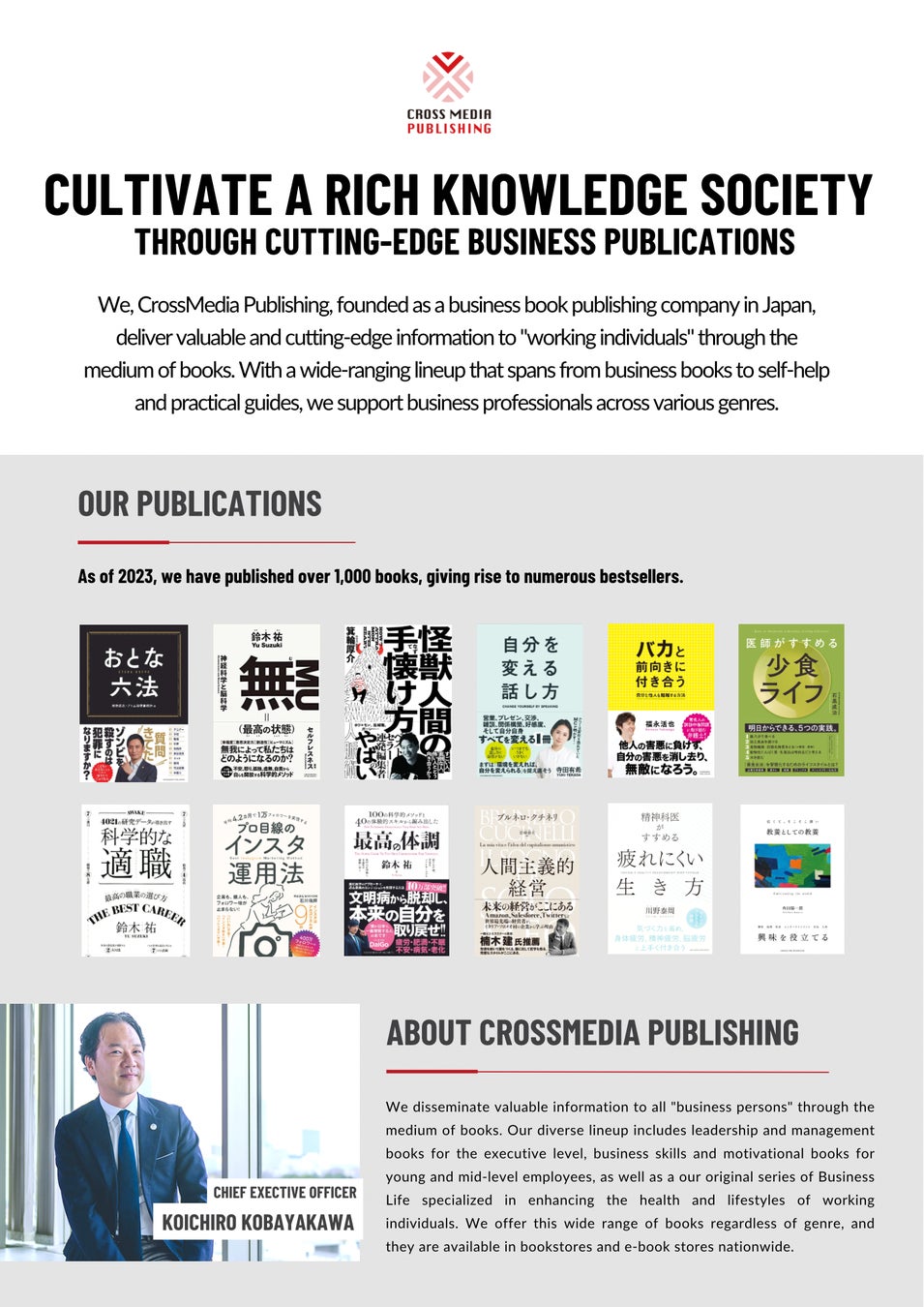 今後もクロスメディア・パブリッシングは、日本の文化、ビジネス書籍や実用書の中にある優良なコンテンツを日本全国、そして、世界に発信し、知識社会の発展に貢献していきます。