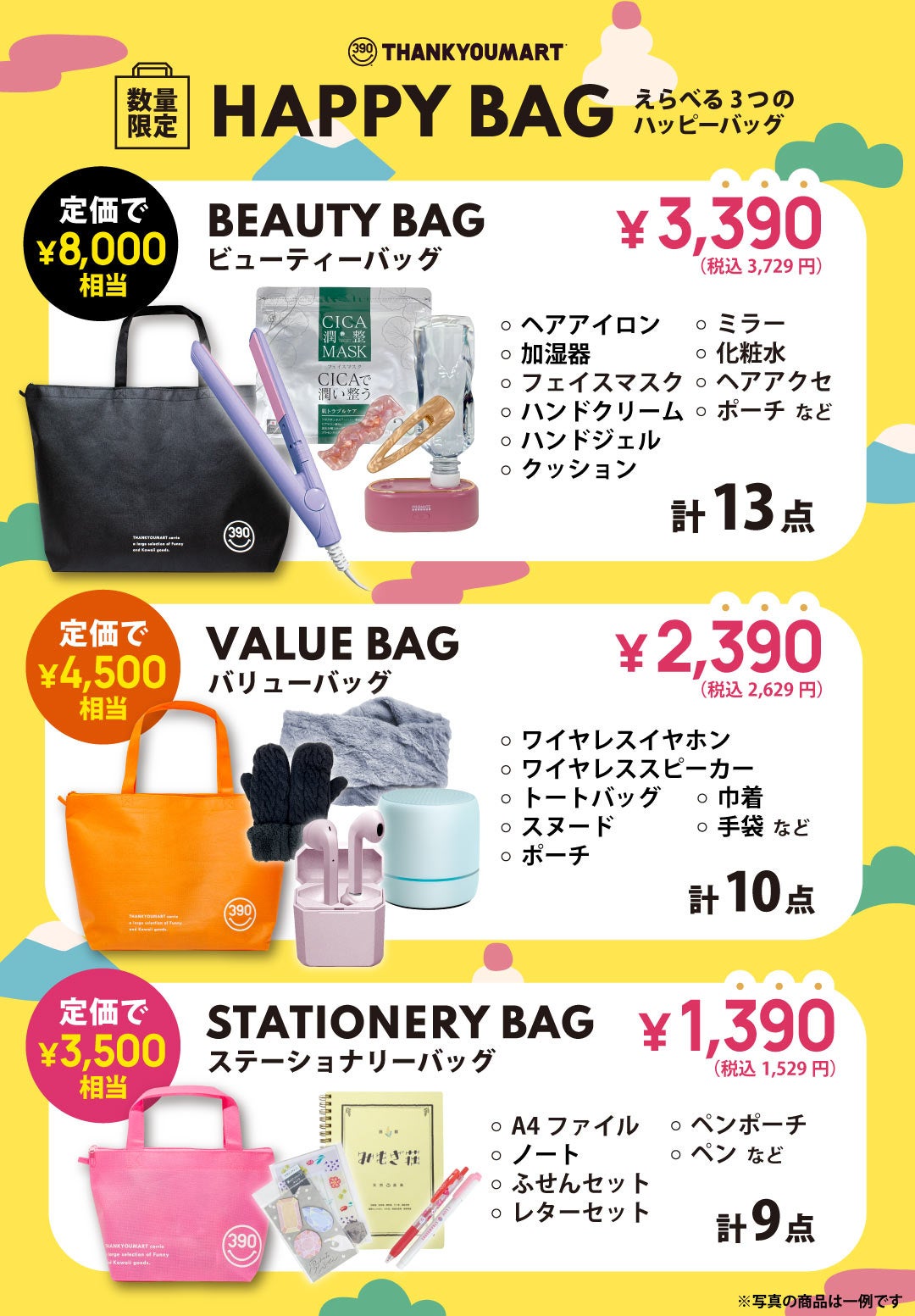 【サンキューマート】1月1日より『HAPPY BAG』3種を数量限定で発売!定価合計8,000円相当のアイテムが、税抜3,390円(税込3,729円)で手に入る大チャンス