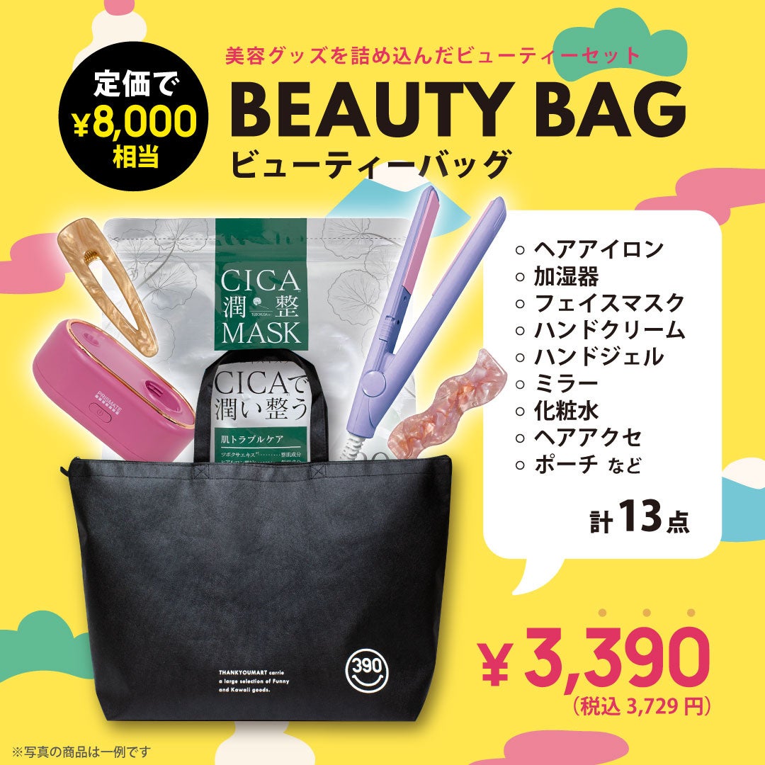 各バッグの販売価格は、末尾3桁を『390(サンキュー)プライス』にかけて税抜1,390円、2,390円、3,390円のラインナップとしています。また、中身は販売額の約2倍相当の商品を入れ、ボリューム感のあるラインナップを目指しました。美容系アイテムが詰まった『BEAUTY BAG』では、大ヒット商品であるストレートアイロン(税抜780円(税込858円))や人気のCICA化粧水やフェイスマスク等、定価合計8,000円相当の13アイテムがなんと税抜3,390円(税込3,729)で手に入るといった大変お得なセット内容です。
