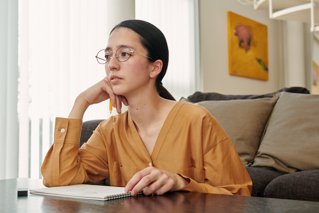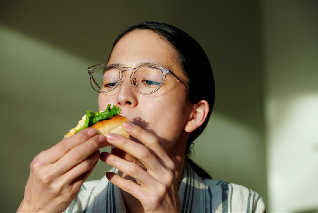 程良く太めのフレームがスタイリングのアクセントに。ボリューム感あるデザインも、フロントやテンプルの角に丸みを持たせることで(甲丸感)やわらかく女性らしい雰囲気に仕上げました。