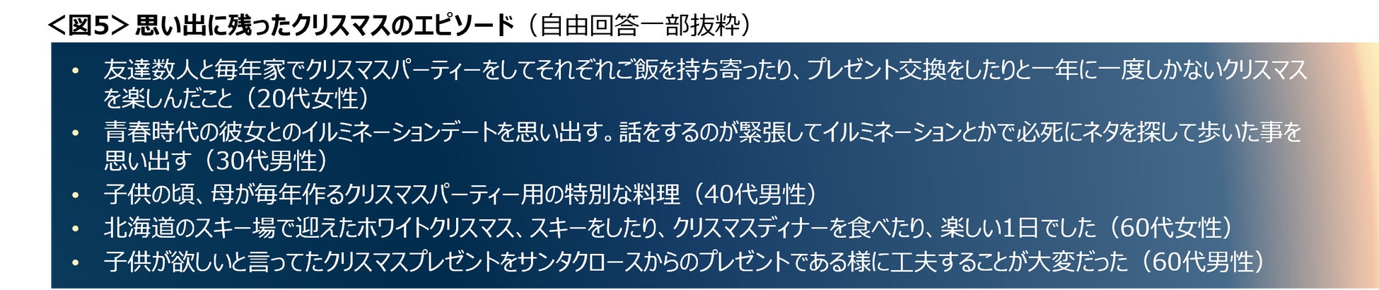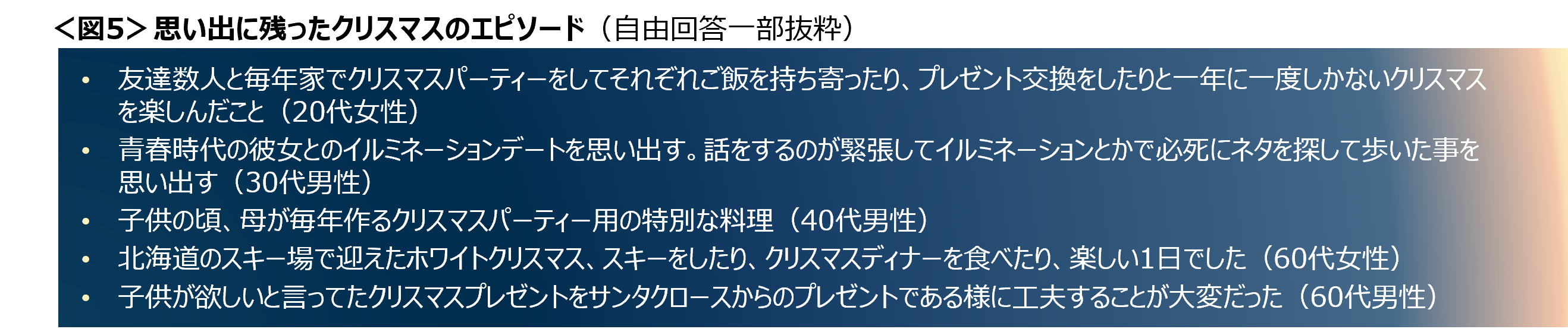 クリスマスの思い出として「クリスマスパーティーをした」「パートナーと特別な一日を過ごした」などのほかに「サンタクロースからのプレゼントのように工夫するのが大変だった」といった声もあがった。<図5>