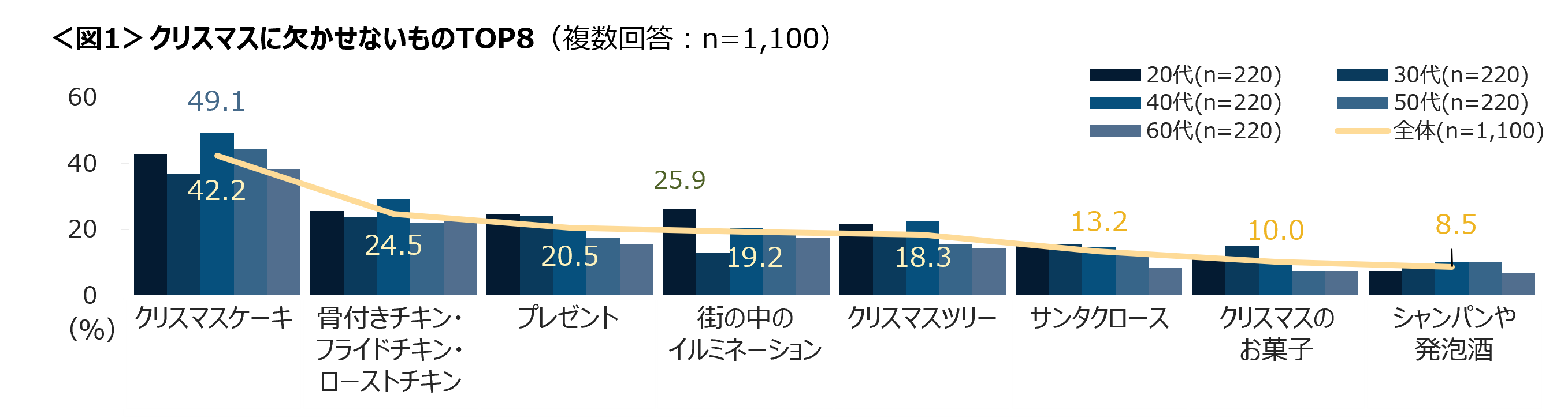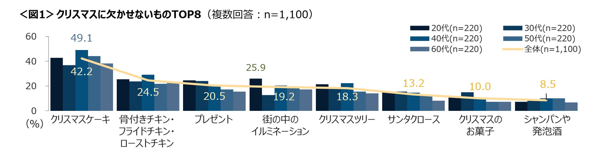 「クリスマスケーキ」は、40代で特に高く49.1%と半数。「街の中のイルミネーション」は20代で25.9%と、他の年代に比べ高い。