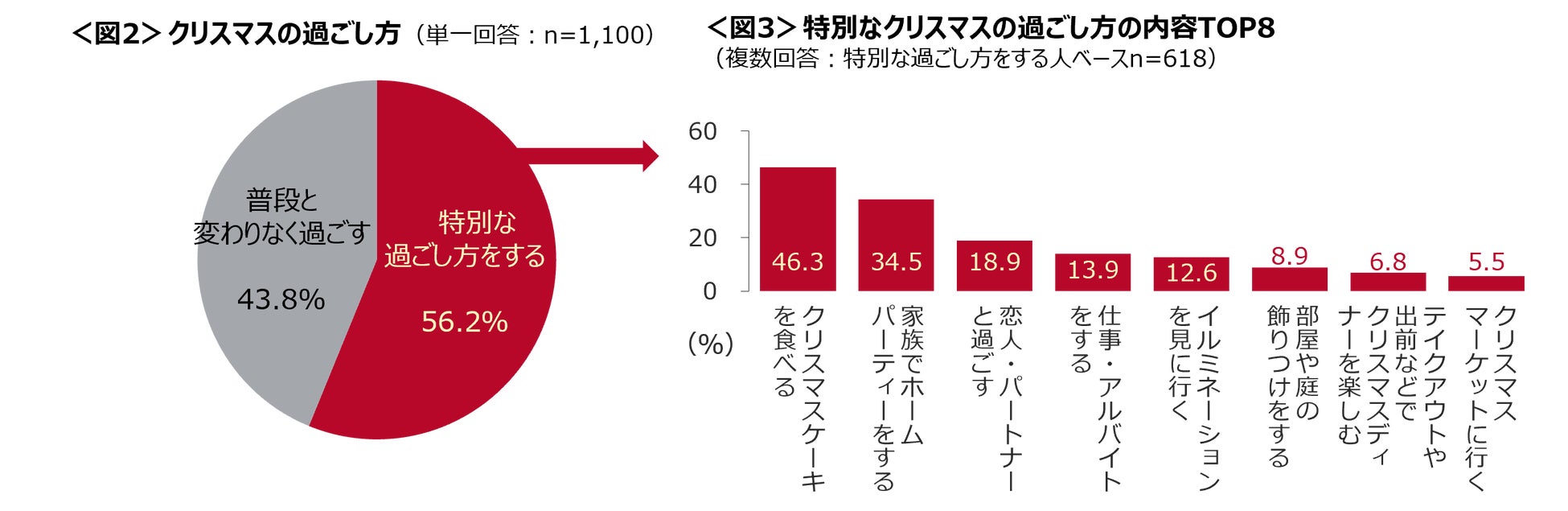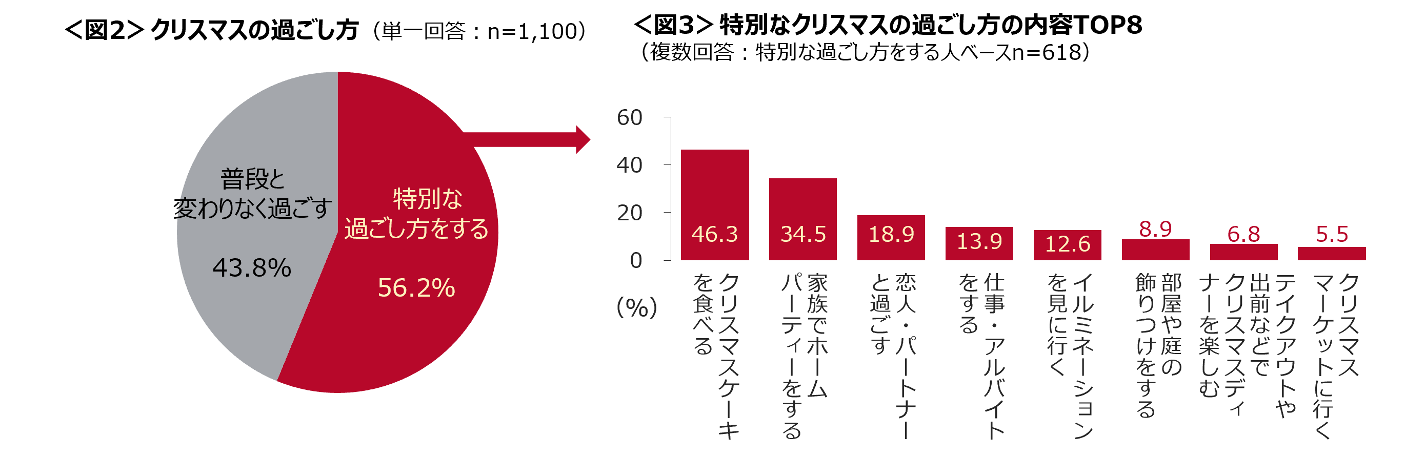 クリスマスの過ごし方は「特別な過ごし方をする」人が56.2%。そのうち「クリスマスケーキを食べる」と答えた人が最も多く46.3%。<図2,3>