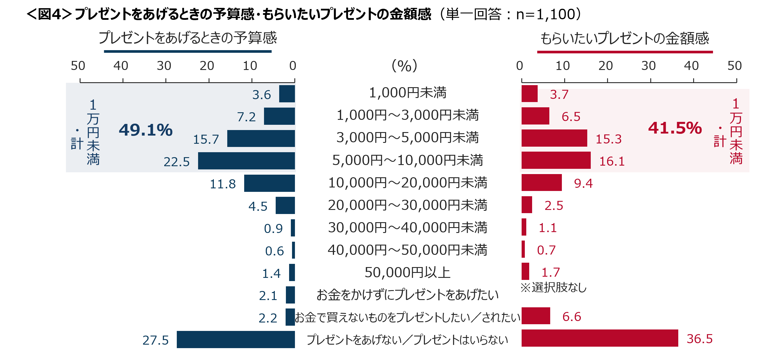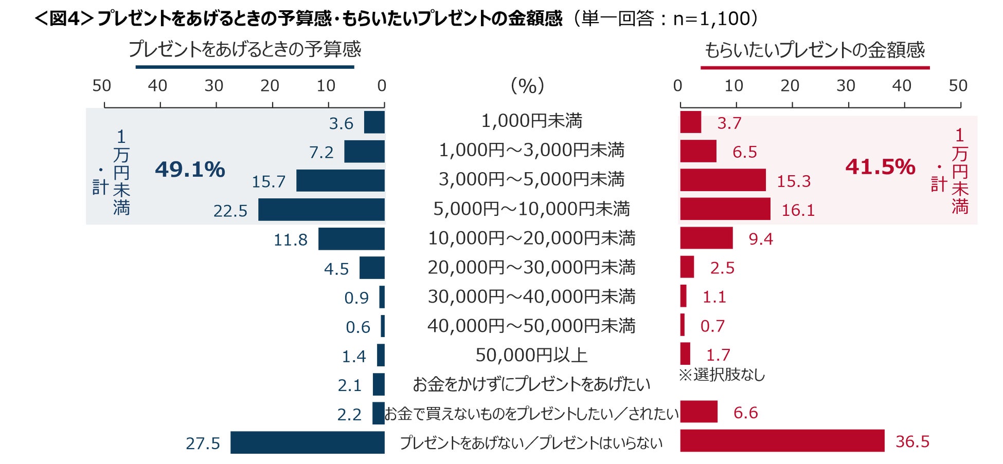 プレゼントをあげるときの予算感は1万円未満との回答が約半数。また、もらいたいプレゼントの金額感は、「5,000円~10,000円未満」が16.1%、「3,000円~5,000円未満」が15.3%で1万円未満の回答は41.5%だった。