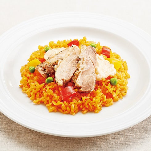 トマトケチャップの酸味をさっぱりと効かせたチキンライスです。食べごたえも充分な鶏のモモ肉をスライスしてトッピング。濃厚でコクのあるホワイトソースをかけて、仕上げました。