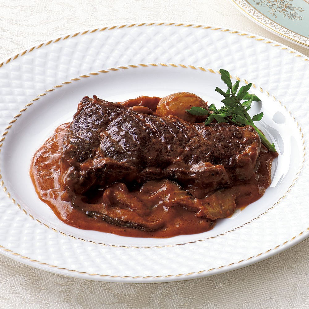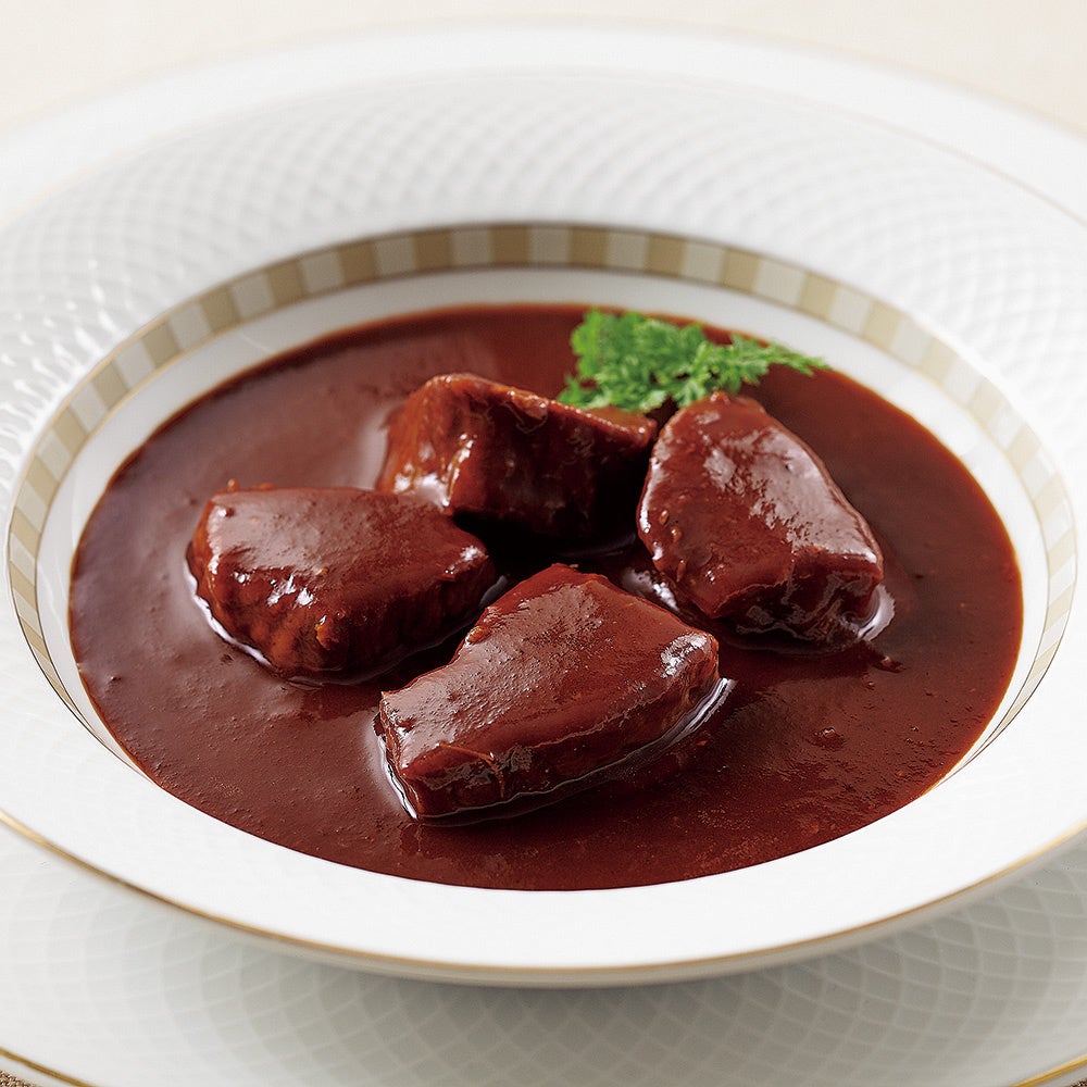 牛肉はブロックの状態でしっかりと煮込み柔らかに仕上げました。ソースには赤ワインを使用し、酸味と色合いに磨きのかかった味わいです。香りが豊かに感じられるよう隠し味にマデラ酒を加えました。