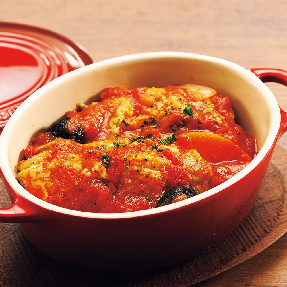 ふっくらと柔らかく仕上げた鶏肉を、甘味と酸味のバランスが絶妙なトマトソースで軽く煮込んでいます。さっぱりとしていて、暑い季節でも食が進む美味しさ。彩りと味のアクセントに、ブラックオリーブを加えました。