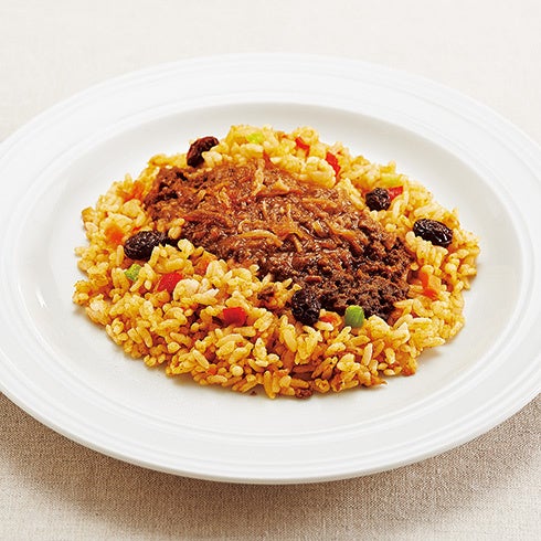 食欲をそそるスパイシーな香りが堪らないドライカレーは、贅沢にも牛挽肉をキーマ風にアレンジしたものをのせ、さらにオニオンソテーとレーズンをのせて食感も豊かに仕上げました。