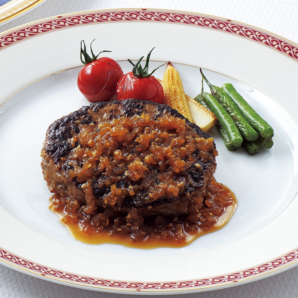 調理人がしっかりと下ごしらえをした、牛肉100%のハンバーグに、香ばしく焼き目を付け、肉の旨みを閉じ込めました。和風ソースは、濃口醤油をベースに、味醂、清酒を使い、トッピングの玉ネギは、おろしニンニク、白ゴマ、ブラックペッパーで味付けしました。上品でありながらクセになる味わいです。