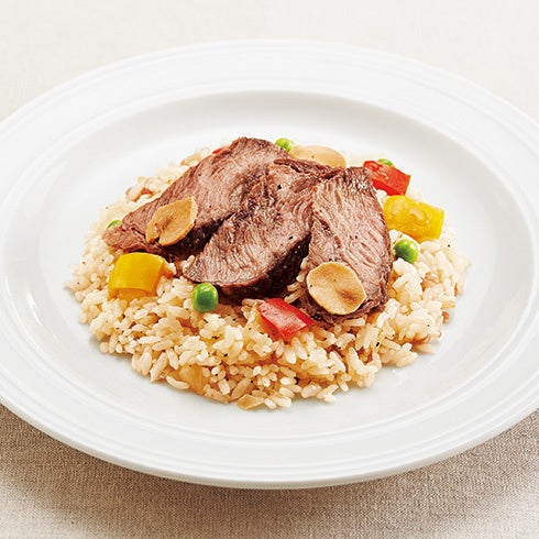 ガーリック風味に味付けしたライスに、スライスしたガーリックチップを合わせ、柔らかく焼き上げた牛肉をトッピングしました。豊かな香りの本格的な味わいで、お酒とも好相性。