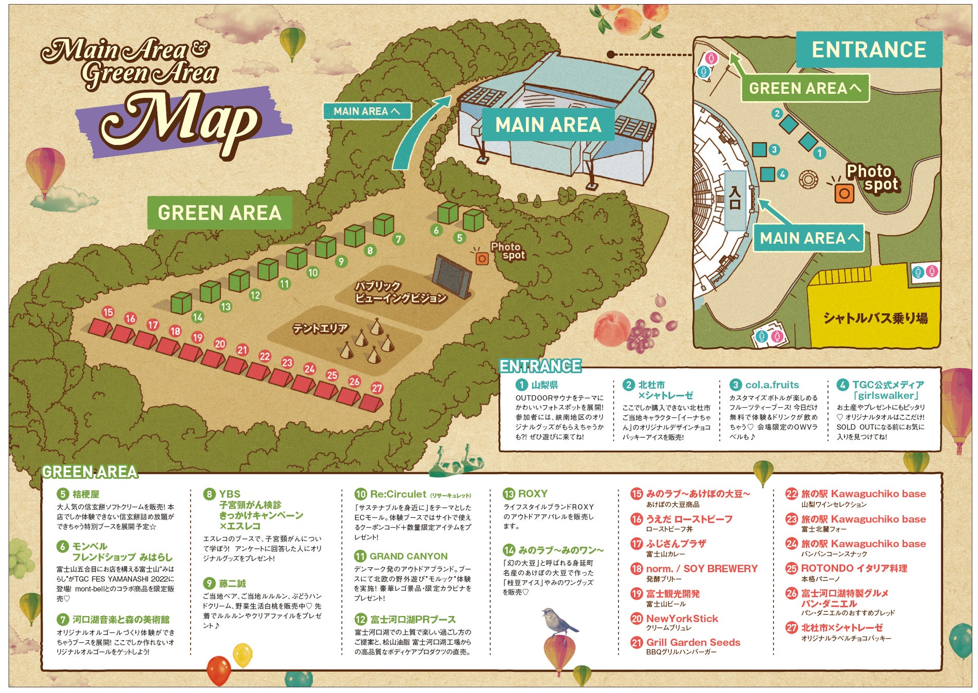 グリーンエリアのブースには、新たにオリジナルオルゴールづくりが体験できる河口湖 音楽と森の美術館、限定アイテムが手に入るECモールのRe:Circulet(リサーキュレット)やデンマーク発のアウトドアブランドGRAND CANYON、ご当地ルルルンが手に入る藤二誠、クリームブリュレを販売するNewYorkStick、BBQグリルハンバーガーを販売するGrill Garden Seedsなどが新たに決定し、合計27ブースが出展します。