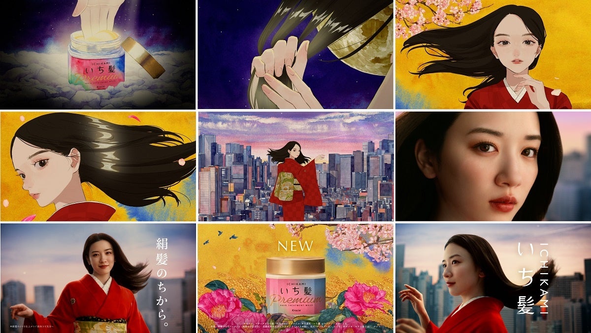 新CM「絹髪のちから」篇は、「日曜日の夜。ひとり、ヘアマスクをする。」というセリフから始まります。日曜日の夜に、「プレミアム ラッピングマスク」によって、強く、しなやかで、美しい髪になり、自分に自信を持ってこれからの一週間の生活に臨む様子を表現しています。ラストは、見返り美人図を彷彿とさせる永野芽郁さんの美しい着物姿と、“絹髪のちから”を得て自信に満ちた表情が印象的です。