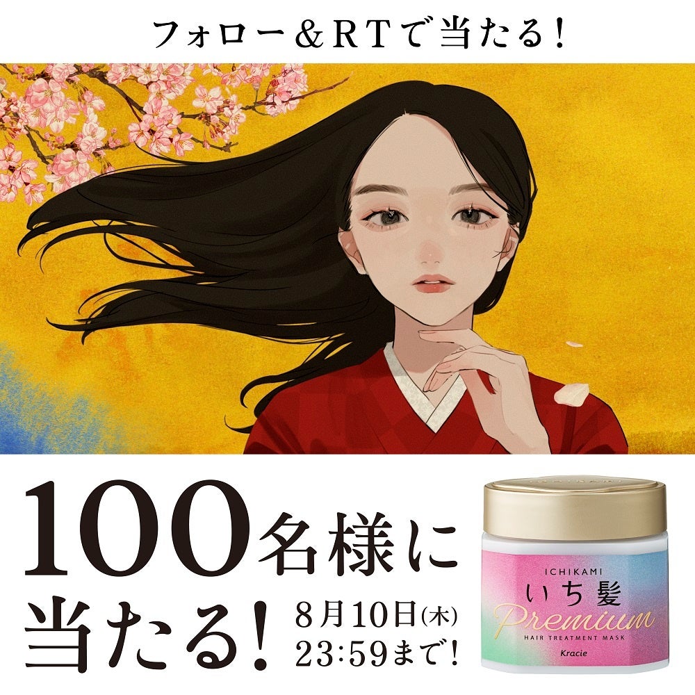 いち髪Twitter公式アカウント(@kracie_ichikami)をフォローして、指定の投稿をリツイートすると、「いち髪 プレミアム ラッピングマスク」現品が100名様に当たります。