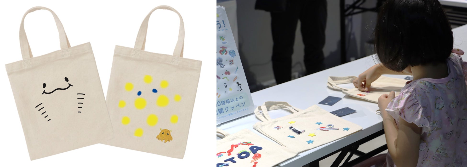 神戸にある五感で感じる劇場型アクアリウム「AQUARIUM×ART átoa」による出張キッズワークショップを開催。アトアスタッフと一緒にドット柄が特徴的なエイ"ポルカドット・スティングレイ"をモチーフにしたトートバッグをキャンバスにして、自由にアートを楽しみながらオリジナルトートバッグを作れます。