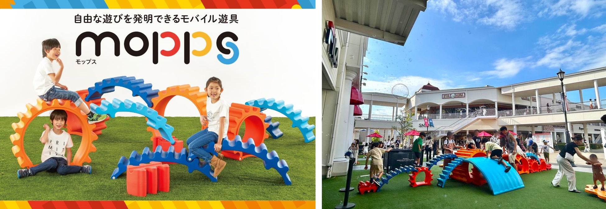 大きなパーツを自由に動かして遊びを発明できる遊具「モップス」が兵庫県の商業施設として神戸三田プレミアム・アウトレットに初登場します。パーツで長い橋を作ったり、秘密基地を作ったり、船をつくったりと、子どもたちの発想で遊びが展開していく遊具で、自由に遊べる楽しい遊び場です。