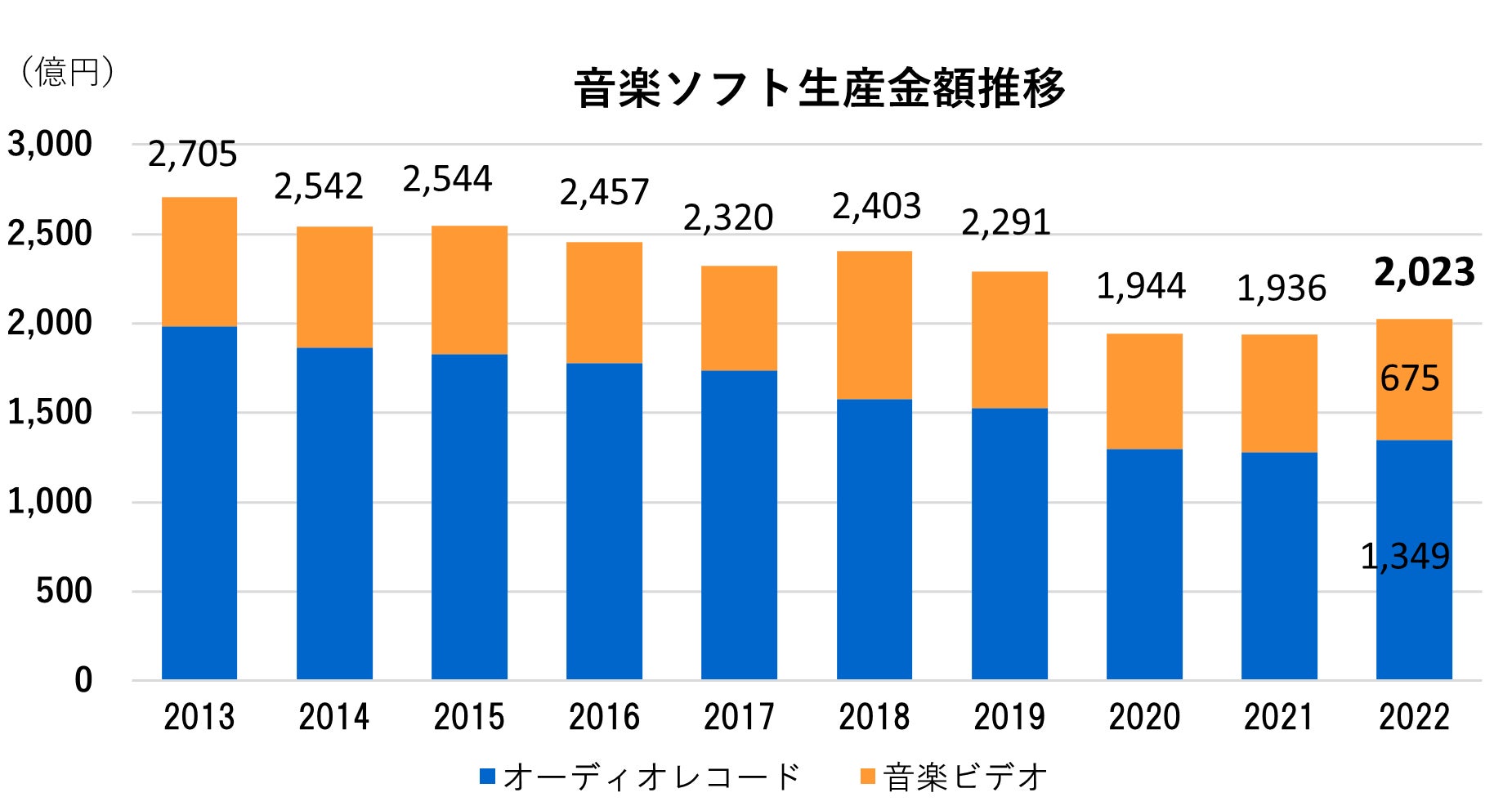 2022年年間の音楽ソフト生産金額は前年比104%の2,023億円で、2019年以来3年ぶりの2,000億円超え。アナログは(過去最低の)2010年の25倍強 43億円まで伸長