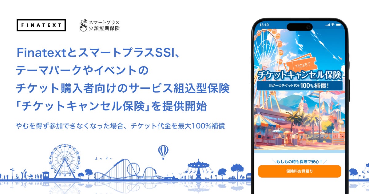 次世代金融インフラの提供を通して組込型金融を実現するFinatextグループの株式会社Finatext(本社:東京都千代田区、代表取締役CEO:木下 あかね、以下「Finatext」)と、MS&ADインシュアランス グループのあいおいニッセイ同和損害保険株式会社(本社:東京都渋谷区、代表取締役社長:新納 啓介)が出資するスマートプラス少額短期保険株式会社(本社:東京都千代田区、代表取締役CEO:小山 宏人、以下「スマートプラスSSI」)は、テーマパークやイベントのチケット購入者が任意で加入できるサービス組込型保険「チケットキャンセル保険」の販売を開始しました。予約したテーマパークやライブ、スポーツ、コンサートなどのイベントにやむを得ず参加できなくなった場合、チケット代金を最大100%補償します。