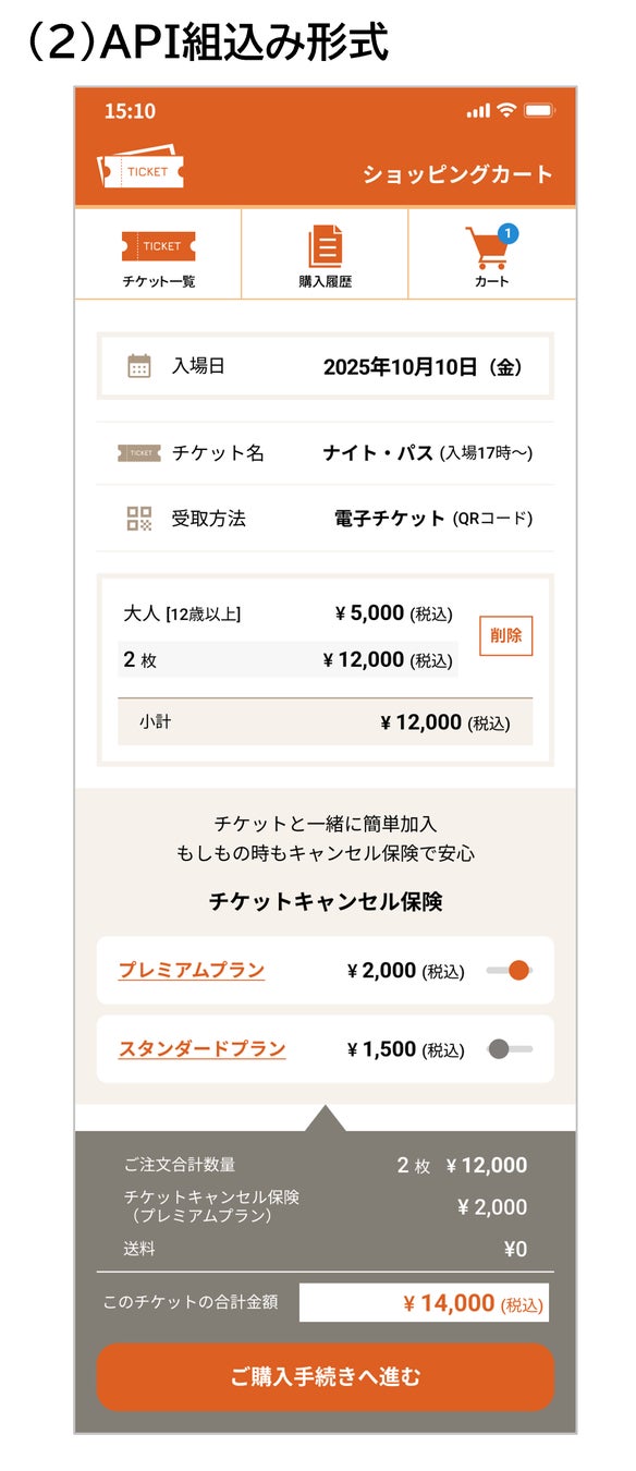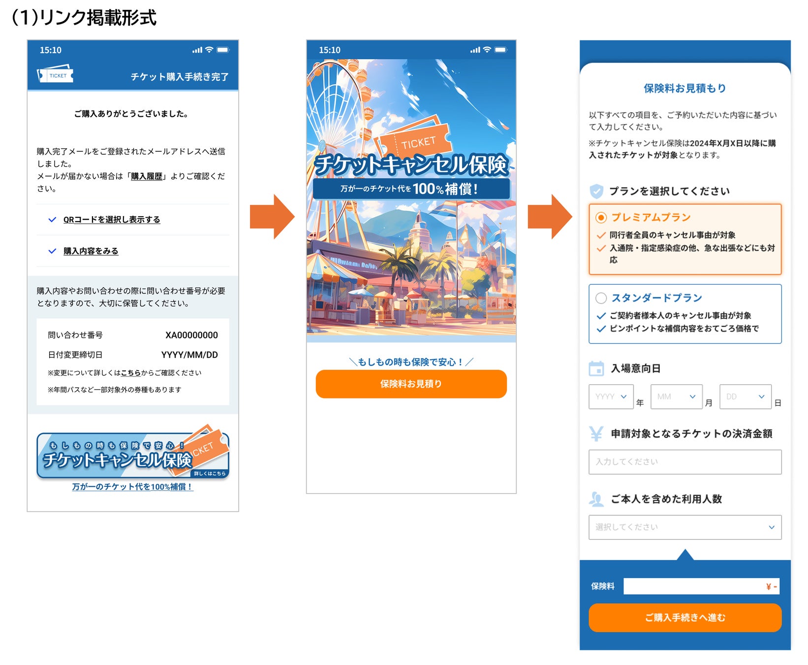 「チケットキャンセル保険」は、テーマパークやイベントのチケット予約サイトに組み込んで提供する保険です。チケット購入完了画面に保険申し込みページへのリンクを掲載する形式と、チケット購入とあわせて保険加入もできるAPI組込み形式の2通りの導入形式があります。