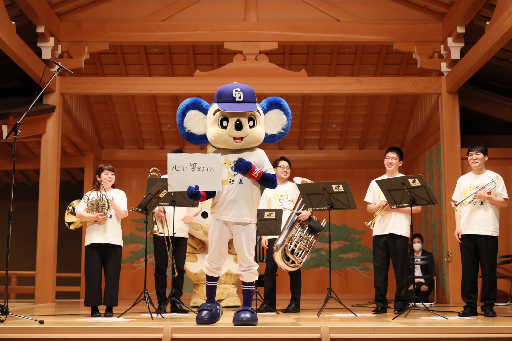 知られざる魅力「芸どころ」名古屋・愛知を名古屋グランパス稲垣祥選手・東ジョン選手と、金鯱グランパスくん、ドアラ、名古屋フィルハーモニー交響楽団金管五重奏が、名古屋能楽堂でアピール