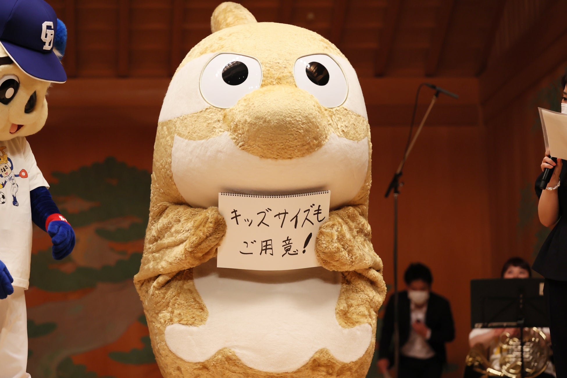 本発表会では、名古屋グランパス公式マスコットのグランパスくんと、中日ドラゴンズ公式マスコットのドアラが、「大名古屋展2022」の応援団として、名古屋能楽堂の舞台に登場。グランパスくんとドアラがプリントされた「『なごやだいすき』グランパスくん×ドアラTシャツ」をPRした金鯱グランパスくんは「キッズサイズも展開されているところがポイント」とコメント。さらに、ドアラは、「名古屋のパワーをぎゅっと詰め込んでいます」とスケッチブックで回答し会場を盛り上げました。