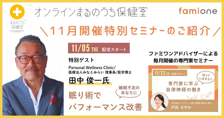 11月のオンラインセミナーには、Personal Wellness Clinic 医療法人みなとみらい 理事長 兼 医学博士 田中 俊一氏、株式会社ファミワン 公認心理師/臨床心理士 戸田 さやかが登壇します。田中氏のセミナーは、「眠り術でパフォーマンス改善」と題し、睡眠の質と仕事パフォーマンスの関係と向上させる方法を学びます。戸田のセミナーでは、自律神経についての最新理論を学び、自分らしくいきいき仕事ができる方法についてお話しいたします。