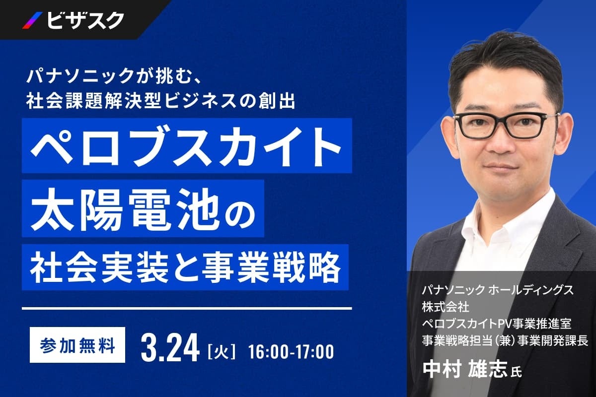 「知見と、挑戦をつなぐ」をミッションにグローバルなナレッジプラットフォームを運営する株式会社ビザスク(以下、当社)は、『パナソニックが挑む、社会課題解決型ビジネスの創出』をテーマに、パナソニック ホールディングス株式会社 ペロブスカイトPV事業推進室 事業戦略担当(兼)事業開発課長 中村 雄志 氏 ご登壇による無料オンラインセミナーを 3/24 (火) 16:00 より開催します。