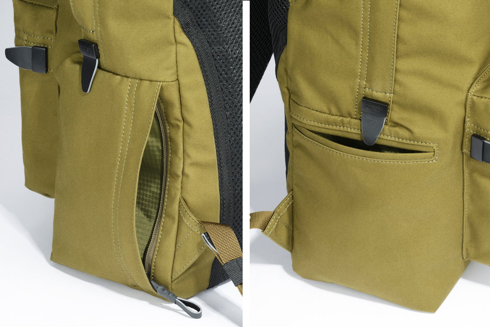 右サイドに片掛け状態でアクセスしやすいファスナーポケットを配置し、左サイドに折り畳み傘やペットボトルを差し込めるオープンポケットを配置。