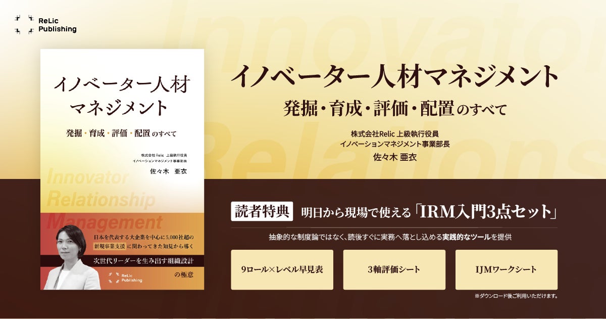 事業共創カンパニーである株式会社Relic(本社:東京都渋谷区、代表取締役CEO:北嶋貴朗、代表取締役CTO:大庭 亮)は、自社が展開する出版レーベル「Relic Publishing」から、第4弾書籍『イノベーター人材マネジメント―発掘・育成・評価・配置のすべて』(著:佐々木 亜衣)を2026年4月24日(金)に刊行しました。本書は、多くの日本企業が直面する「新規事業を任せられる人材がいない」「適切な評価ができない」という課題に対し、Relicが培ってきた広範な支援実績と独自の「IRM(Innovator Resource Management)」のフレームワークを用いた解決策を提示するものです。